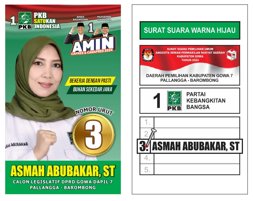Optimistis PKB raih jatah satu kursi DPRD Gowa di Dapil 7 ( Pallangga, Barombong) membuat caleg nomor urut 3 Asmah Abubakar cukup intensif dan massif melakukan sosialisasi didapilnya ( red, Pallangga, Barombong) untuk menguatkan dan meyakinkan masyarakat pemilh untuk mencoblos namanya pada tanggal 14 Februari 2024.