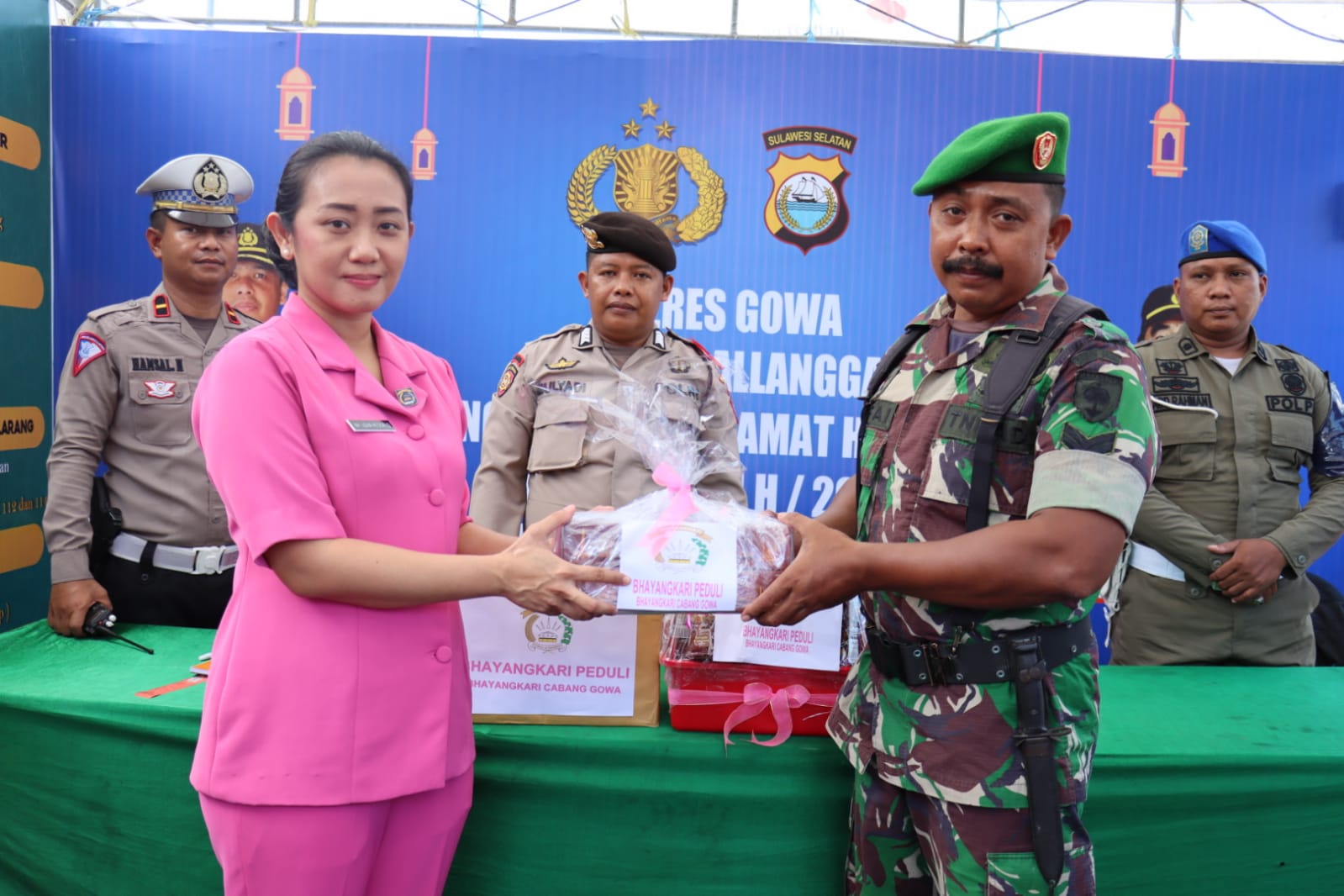 Transnusi.com Kab.Gowa — ketua Bhayangkari Cabang Gowa Ny. Lidya Reonald Simanjuntak mendatangi Pos Pengamanan Operasi Ketupat 2023 Polres Gowa.