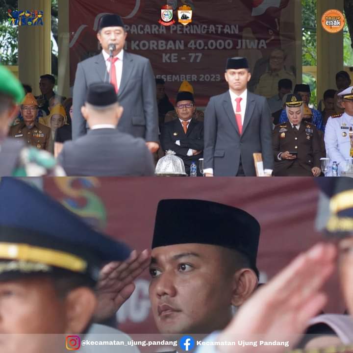 Transnusi.com Makassar — Camat Ujung Pandang Syahrial Syamsuri S.IP, MM, Mengikuti Upacara Bendera Peringatan Hari Korban 40.000 Jiwa, Rakyat Sulawesi Selatan ke 77 Tahun 2023 di Monumen Korban 40.000 Jiwa yang beralamat dijalan Langgau Kecamatan Tallo, Kota Makassar, Senin (11/12/2023).