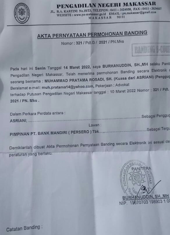 Diketahui Pengadilan Negeri Makassar melakukan eksekusi berdasarkan putusan yang memenangkan gugatan pemohon Hady Purwanto terhadap termohon eksekusi Asriani.
