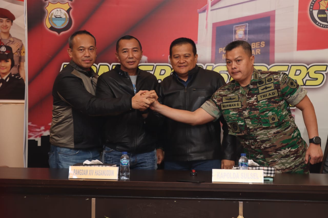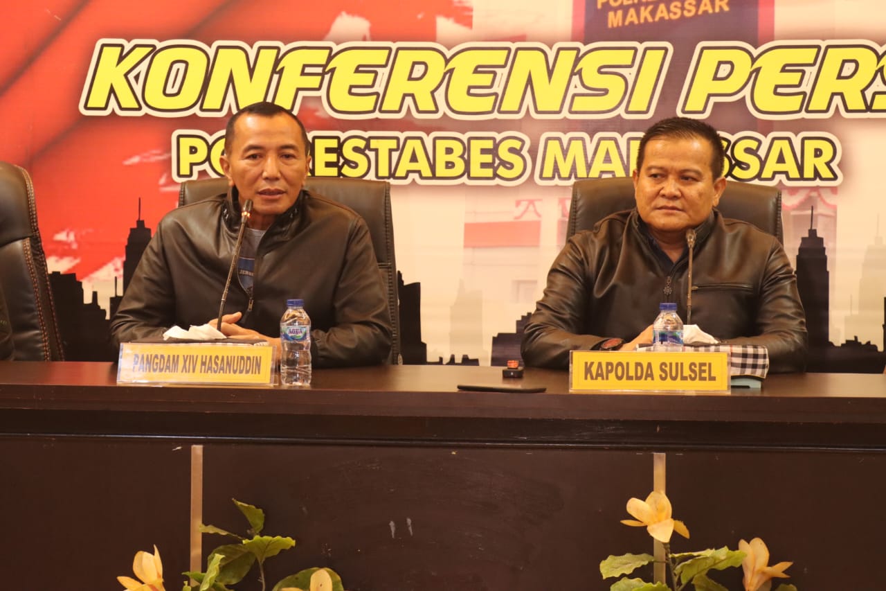 Transnusi.com Makassar — Polda Sulsel Irjen Setyo Boedi Moempoeni Harso,S.H., M.Hum dan Pangdam XIV Hasanuddin Mayjen TNI Dr. Totok Imam Santoso, menggelar Konferensi Pers terkait