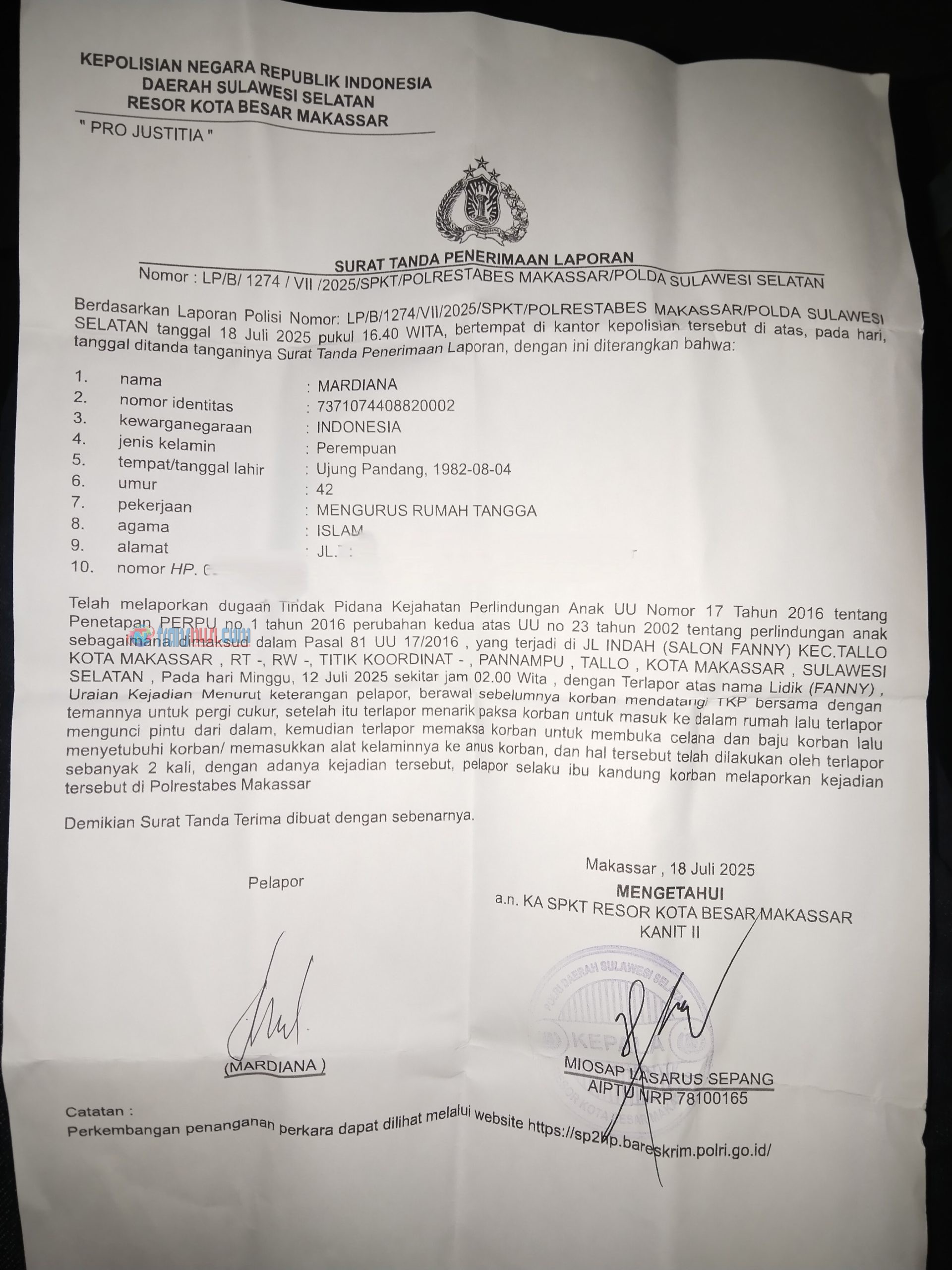 Berdasarkan Laporan Polisi Nomor: Lp/B/1274/VII/2025/SPKT/Polrestabes Makassar/Polda Sulawesi Selatan