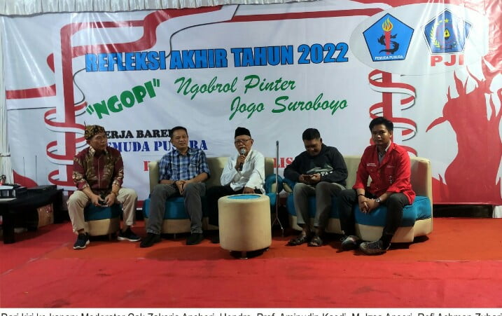 Transnusi.com Surabaya — Sebagai bentuk refleksi akhir tahun 2022, PJI (Persatuan Jurnalis Indonesia) dan Pemuda Pusura kerja bareng mewujudkan acara “Ngopi” (Ngobrol Pinter) dengan tema “Jogo Suroboyo” di halaman PUSURA Jl. Yos Sudarso No 9 Surabaya, Jum’at 30/12/2022. Acara dimoderatori Zakaria Anshori, SH, MH, MKn./Cak Zakaria.