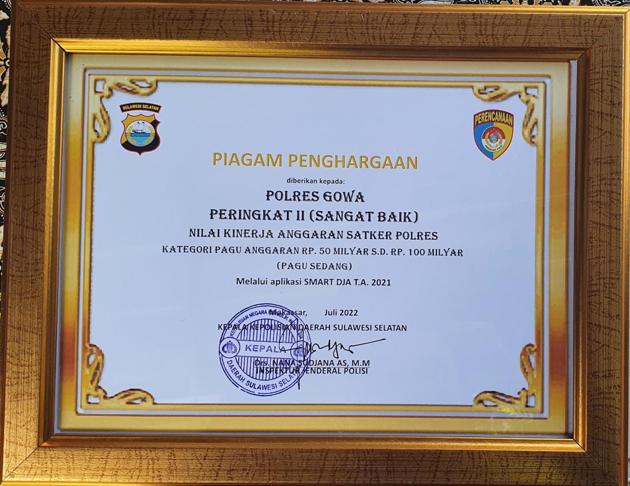 Kapolres Gowa AKBP Tri Goffarudin P, S.IK, MH, yang hadir pada kegiatan tersebut juga menerima penghargaan yang diserahkan langsung oleh Kapolda Sulsel sebagai Peringkat II Satker Polres yang memiliki nilai kinerja anggaran kategori sangat baik melalui aplikasi SMART DJA T.A. 2021 Kategori Pagu Sedang.