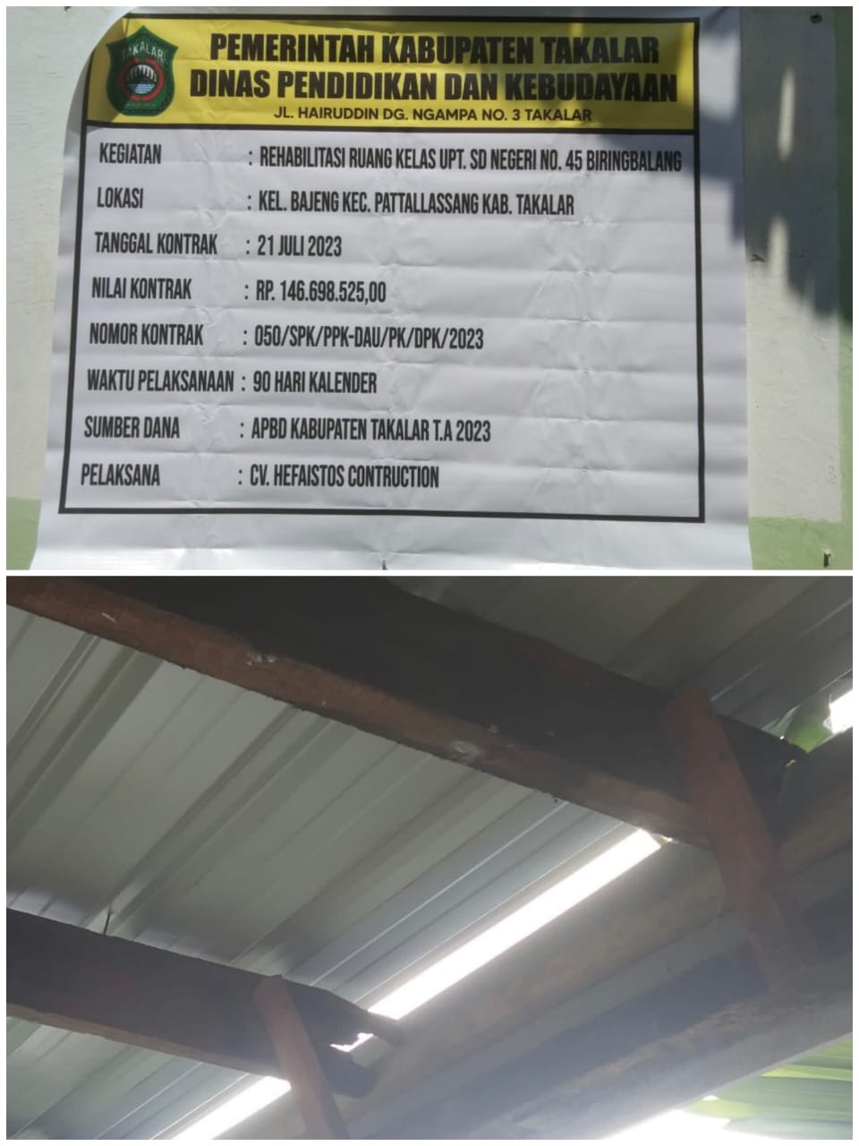 Salahsatu temuan yang diduga, Telah terjadi penyalahgunaan anggaran sebuah proyek, rehabilitasi ruang kelas. Yang terdapat, di SDN No.45 BIRINGBALANG Kelurahan Bajeng kecamatan Pattallassang Kabupaten Takalar. Dengan menggunakan anggaran APBD, Tahun anggaran 2023. Dengan nilai anggaran Rp.146.698.525.
