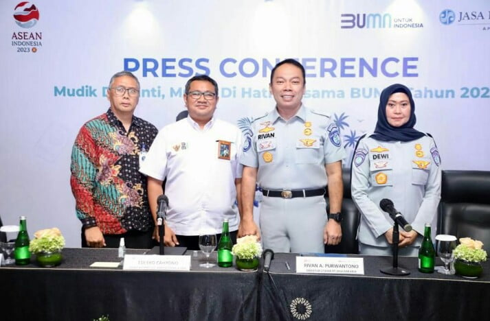 Konferensi pers peluncuran program mudik gratis BUMN 2023 dihadiri Asisten Deputi TJSL, Kementerian BUMN, Edi Eko Cahyono dan Direktur Utama Jasa Raharja Rivan A. Purwantono selaku PIC program tersebut di Bandung, Jawa Barat.