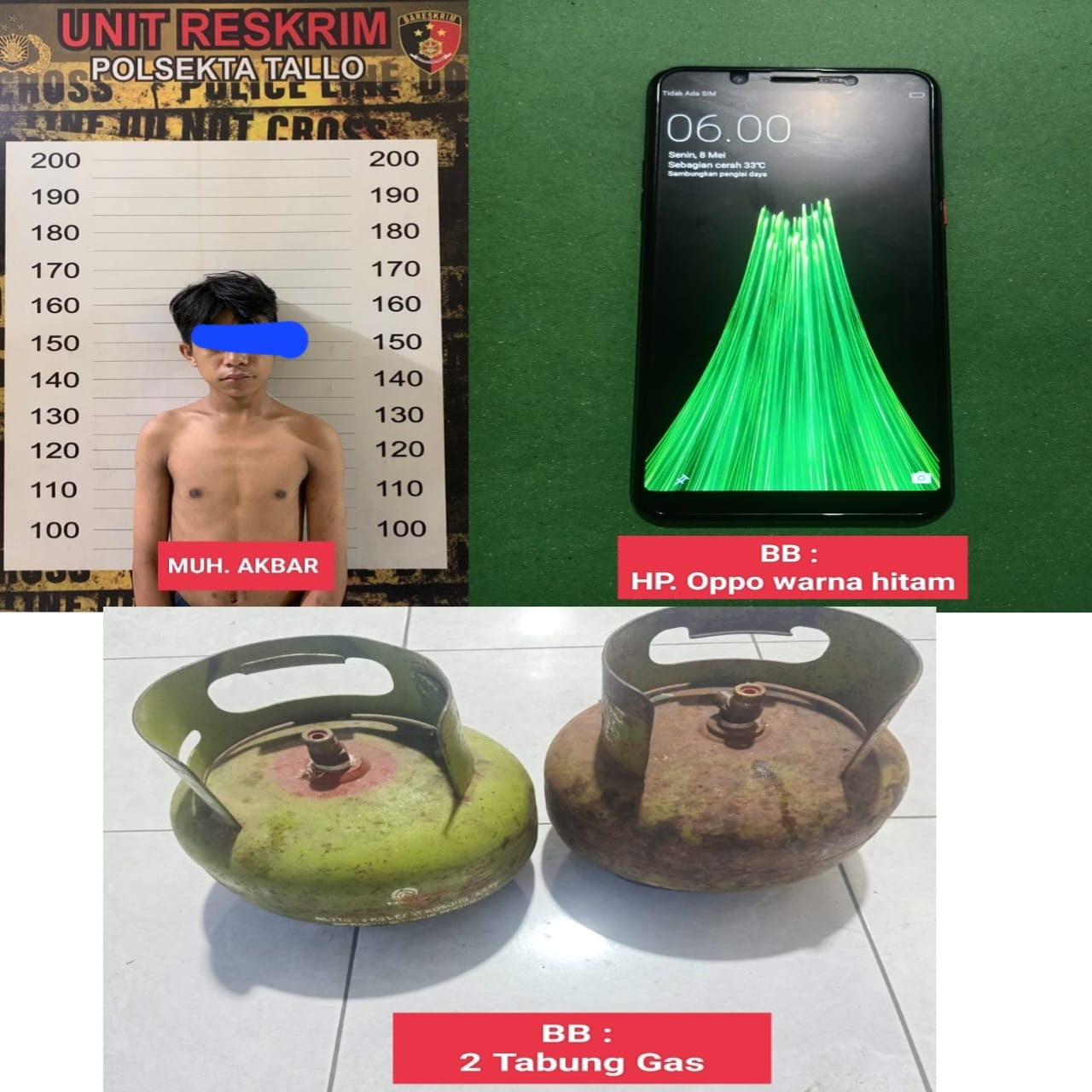 Anggota Opsnal melakukan penyelidikan dan mendapat petunjuk bahwa pelaku Pencurian handphone Oppo warna hitam dan 2 buah tabung gas diduga remaja yang sering bermain di sekitaran rumah korban, atas petunjuk tersebut Anggota Opsnal mengamankan Lk. MUH. AKBAR di rumahnya saat dirinya sedang tertidur.
